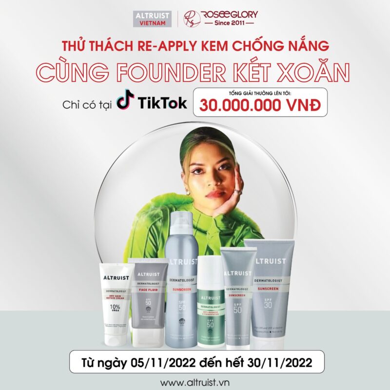Trước đó, trend mới trên Tiktok – Thử thách Re-apply kem chống nắng cùng Altruist Sunscreen thu hút sự quan tâm của nhiều bạn trẻ với giải thưởng giá trị lên tới 30 triệu đồng.