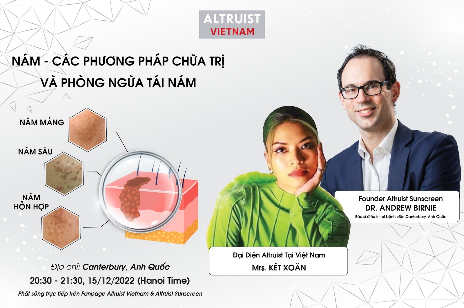 Tiếp nối chuỗi sự kiện hữu ích cho cộng đồng làm đẹp, tháng 12/2022, Altruist Vietnam kết hợp cùng Altruist Sunscreen tổ chức chương trình phát sóng trực tiếp từ Canterbury, Anh Quốc về chủ đề chăm sóc da nám, điều trị nám và ngăn ngừa tái nám. Chương trình có sự tham gia của các khách mời đặc biệt: Founder Altruist Sunscreen – Dr. Andrew Birnie (Bác sĩ điều trị tại bệnh viện Canterbury, Anh Quốc và Đại diện Altruist tại Việt Nam – Mrs. Két Xoăn.