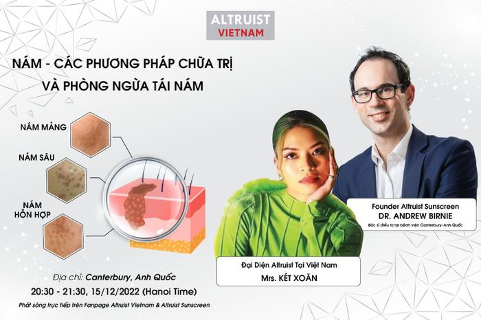 Altruist Sunscreen tổ chức chương trình phát sóng trực tiếp từ Canterbury, Anh Quốc về chủ đề chăm sóc, điều trị nám và ngăn ngừa tái nám. Chương trình có sự tham gia của các khách mời đặc biệt: Founder Altruist Sunscreen - Dr. Andrew Birnie (Bác sĩ điều trị tại bệnh viện Canterbury, Anh Quốc và Đại diện Altruist tại Việt Nam - Mrs. Két Xoăn.